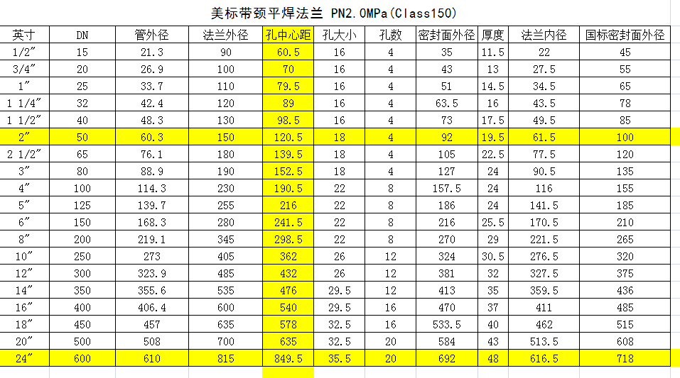 美標(biāo)法蘭通常是指作為美國(guó) 國(guó) 家標(biāo)準(zhǔn)的ASME B16.5、B16.36、b16.47、B16.48所描述的法蘭標(biāo)準(zhǔn)。美標(biāo)法蘭的壓力等級(jí)適用再PN2.5~PN4.0。材質(zhì)可為碳鋼、304、316、316L等。美標(biāo)法蘭尺寸標(biāo)準(zhǔn)和我們國(guó)標(biāo)或者行標(biāo)法蘭不同。那么,美標(biāo)帶頸平焊法蘭的尺寸是怎樣的呢?下面我們來了解一下: